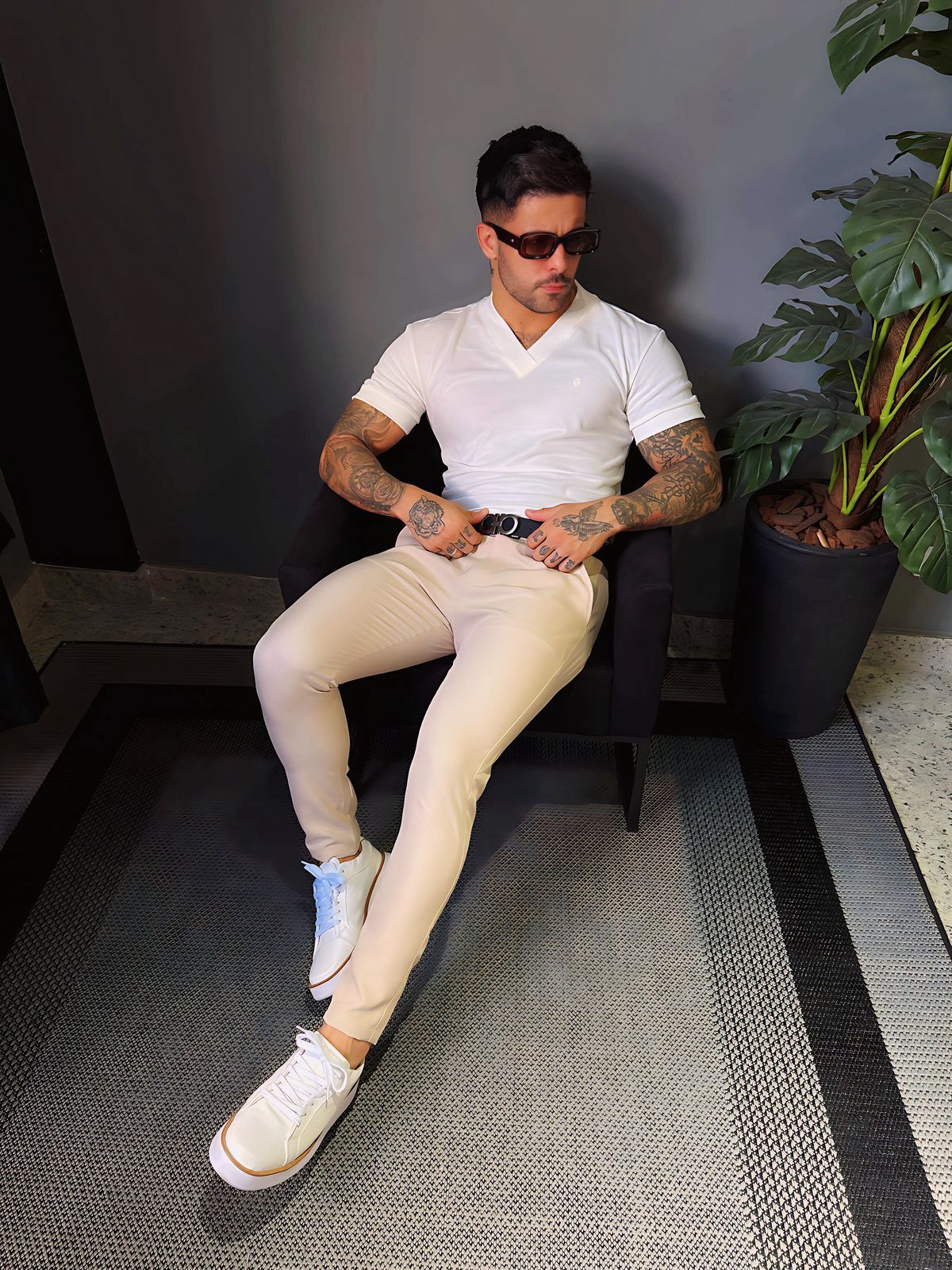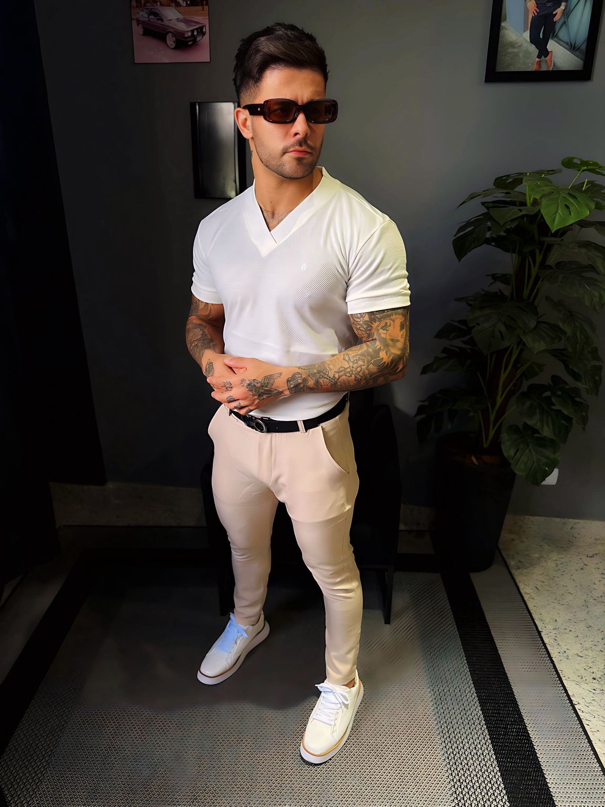 Modelo tem 1,72 altura 84kg, na foto veste M.