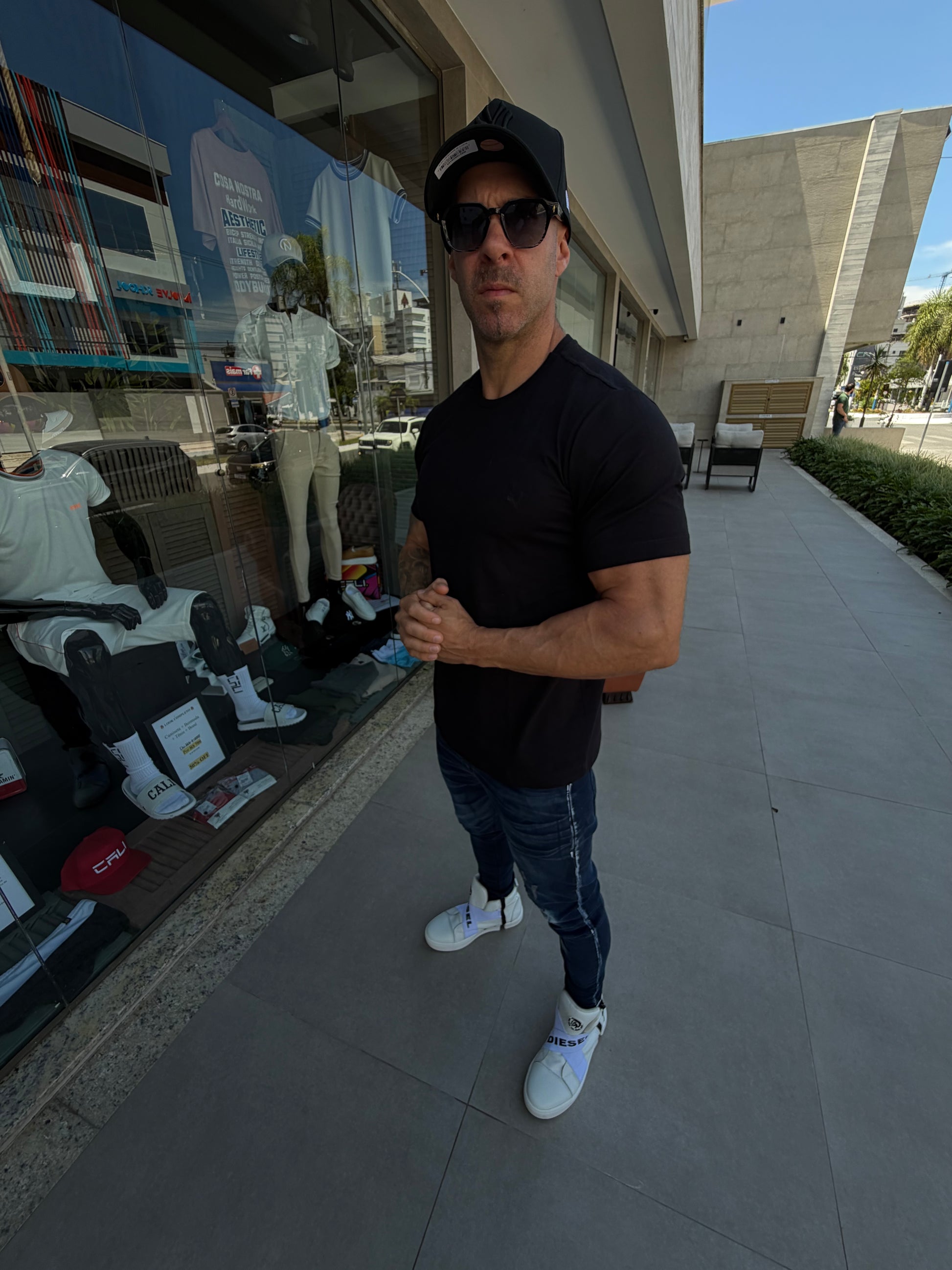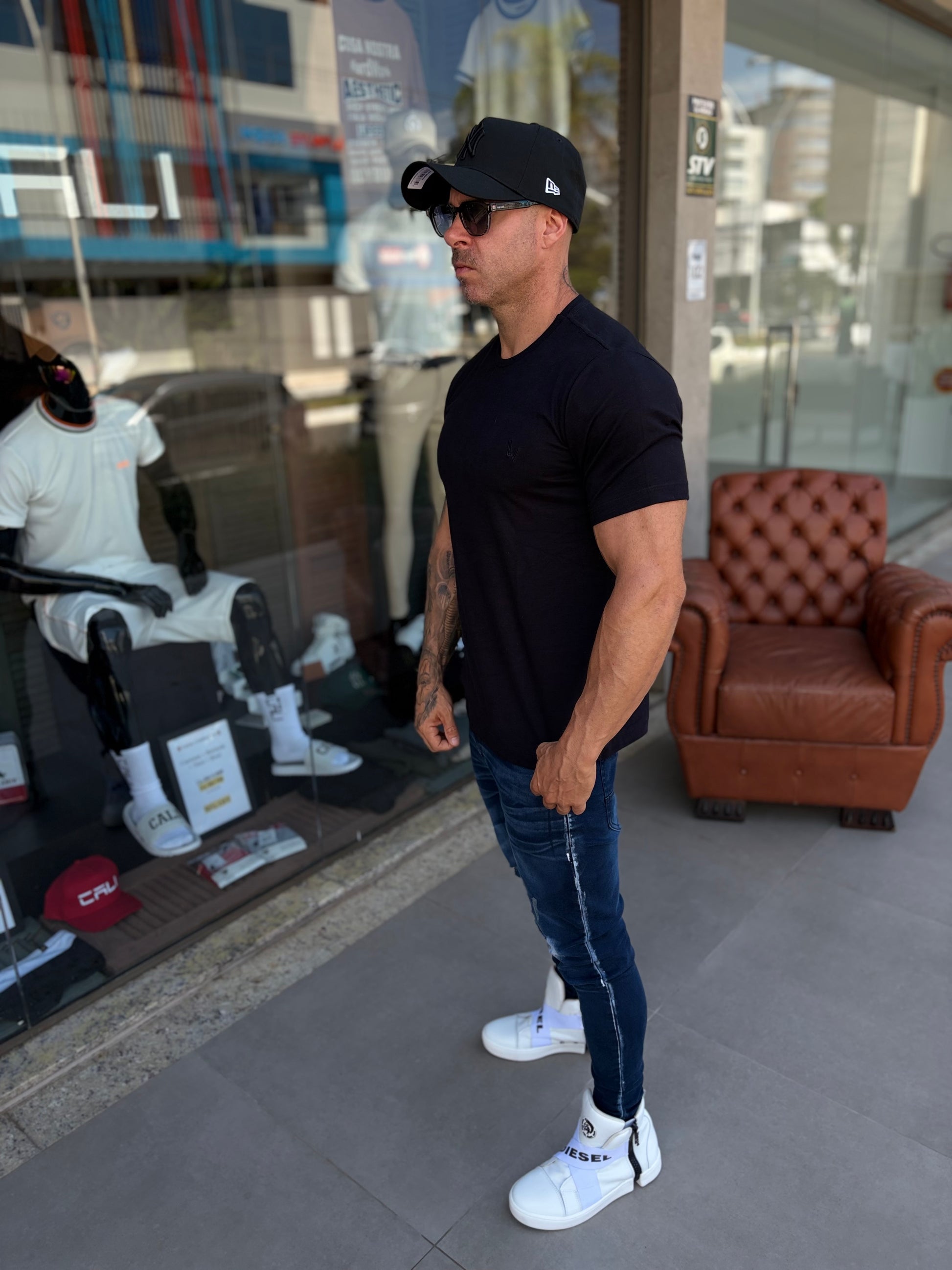 Modelo tem 1,72 altura 86kg, na foto veste M.
